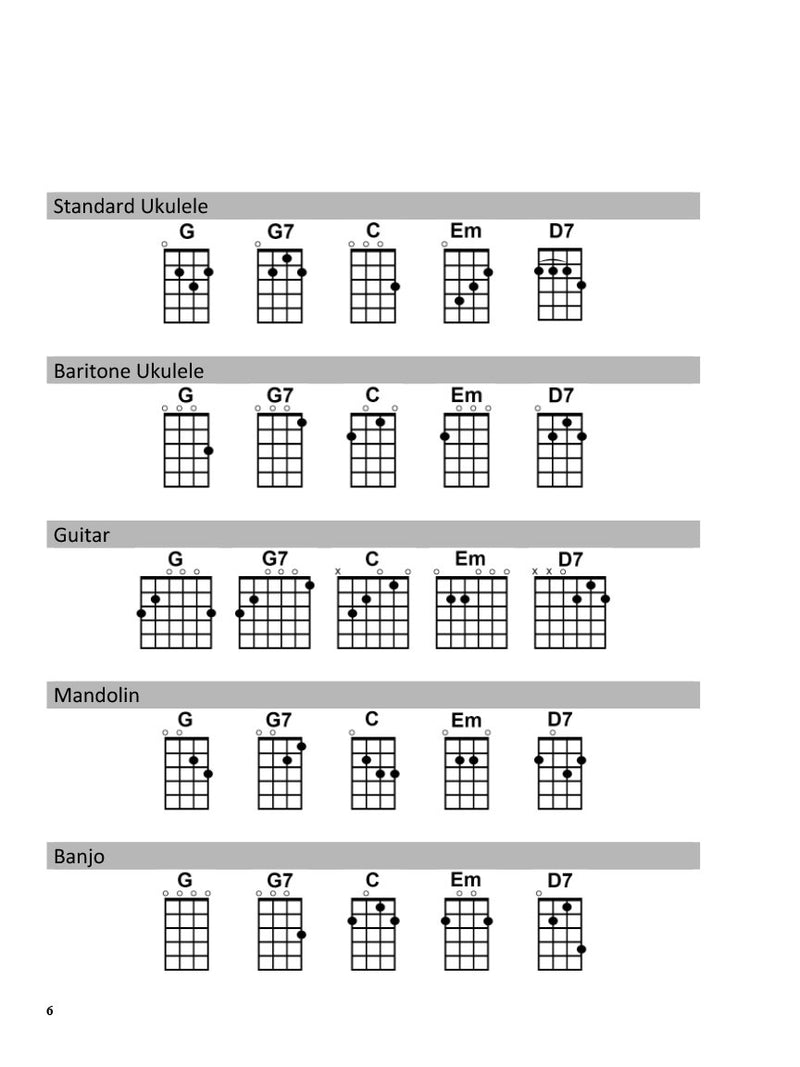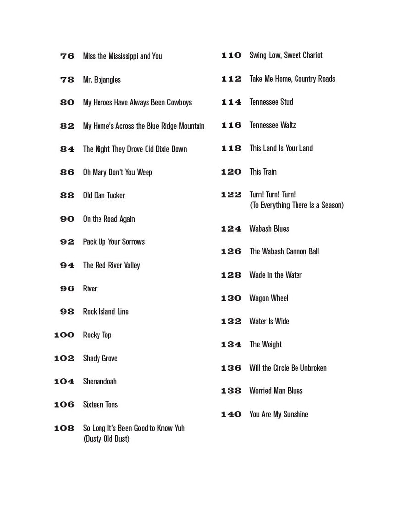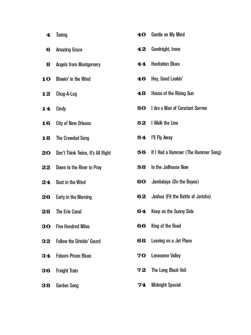 Named one of the Best Mandolin Books of All Time by BookAuthority.org! The Strum Together series enables players of five different instruments - or any combination of them - to strum together on 68 great songs. This new, easy-to-use format features melody, lyrics, and chord diagrams for five popular folk instruments: standard ukulele, baritone ukulele, guitar, mandolin, and banjo. This collection includes 68 classic Americana standards and traditional folksongs featuring: Blowin' in the Wind · City of New Orleans · Down to the River to Pray · The Erie Canal · Folsom Prison Blues · Gentle on My Mind · Hey, Good Lookin' · House of the Rising Sun · I Am a Man of Constant Sorrow · Keep on the Sunny Side · King of the Road · Leaving on a Jet Plane · The Night They Drove Old Dixie Down · The Red River Valley · Sixteen Tons · Take Me Home, Country Roads · Tennessee Waltz · This Land Is Your Land · Wade in the Water · You Are My Sunshine · and many more.