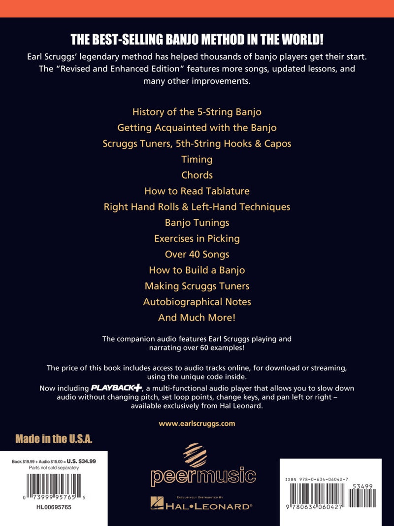 The best-selling banjo method in the world! Earl Scruggs's legendary method has helped thousands of banjo players get their start. The Revised and Enhanced Edition features more songs, updated lessons, and many other improvements. It includes everything you need to know to start playing banjo, including: a history of the 5-string banjo, getting acquainted with the banjo, Scruggs tuners, how to read music, chords, how to read tablature, right-hand rolls and left-hand techniques, banjo tunings, exercises in picking, over 40 songs, how to build a banjo, autobiographical notes, and much more! The book/audio version includes recordings of Earl Scruggs playing and explaining over 60 examples! Audio is accessed online using the unique code inside the book and can be streamed or downloaded. The audio files include PLAYBACK+, a multi-functional audio player that allows you to slow down audio without changing pitch, set loop points, change keys, and pan left or right.